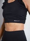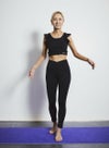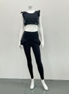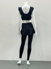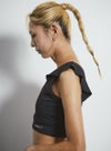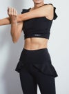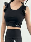 動きを制限せず、肩から胸・背中にかけてのラインを美しく見せる甘すぎないフリルタイプのブラトップ。