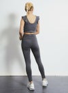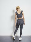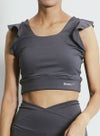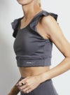 動きを制限せず、肩から胸・背中にかけてのラインを美しく見せる甘すぎないフリルタイプのブラトップ。